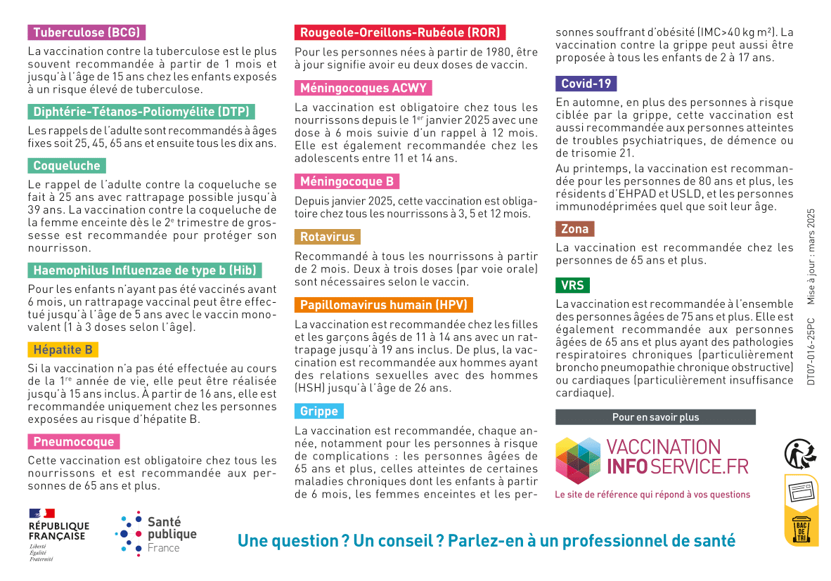 Il est recommandé de vérifier régulièrement que ses vaccinations sont à jour, notamment :
